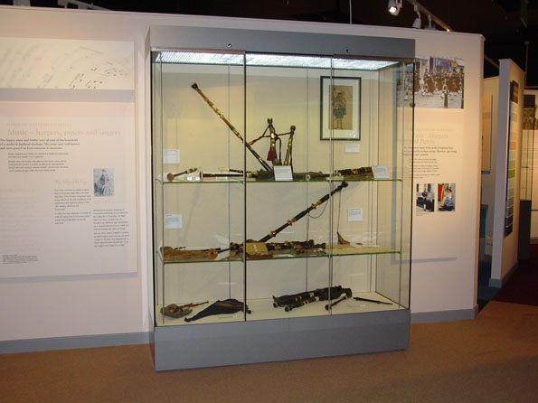 Wall standing display case with two front doors, fluorescent lighting hood, environment control and adjustable shelves. The rear panel and base plate are fabric covered.