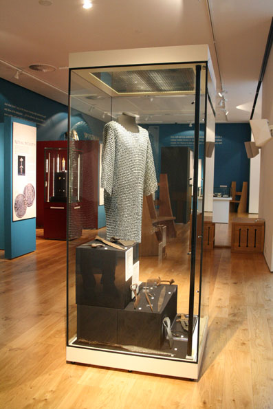Free-standing display case made with high security anti-bandit glass and fitted with a concealed environment control chamber. Illumination of the display objects is with a lighting hood and two vertical fibre-optic light tubes for optimum illumination of display objects. Access is by a full width hinged door