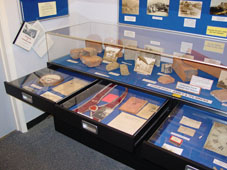 Coggeshall's volunteer-run Museum was established to preserve the village's historic past and to carry on recording today's events for generations to come. The memorabilia on show has been donated by local people and the exhibits change from year to year, different themes taking precedence, so there is always something new to see. Just recently the Museum commissioned Britannia Storage Systems Ltd, based just up the road on Earls Colne Business Park (the former wartime airfield) to make 3 cases, the largest of which holds an important collection of medieval tiles from the former Cistercian abbey at Coggeshall. It is hoped that visitors to the museum, whether from Coggeshall itself or from further afield, will find something of interest in their look at Coggeshall's past and, above all, will enjoy their visit and come again. Click on the thumbnails below for larger views of the display cases.